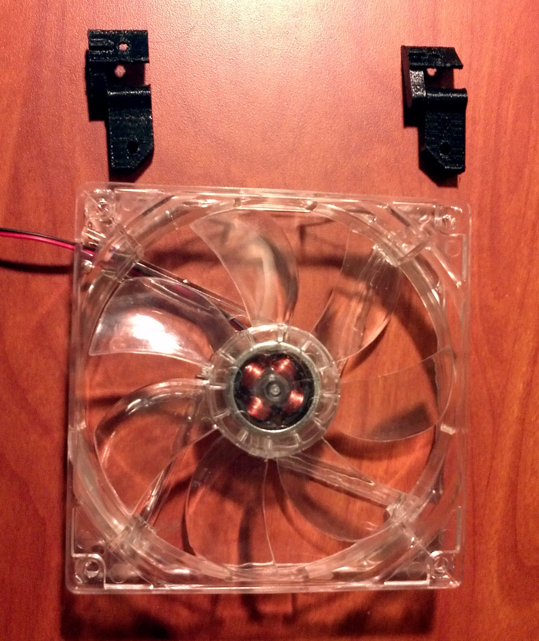 I also added two cooling fans to my setup while it was apart. These fans are mounted on hinges of my design to allow them to swing out of the way when not in use, as well as coarsely aim them at the print. The fans are big PC cooling fans since they’re cheap and run on the same voltage as my control board. These are also programmed in the controller to automatically turn on at a specific time during a print.